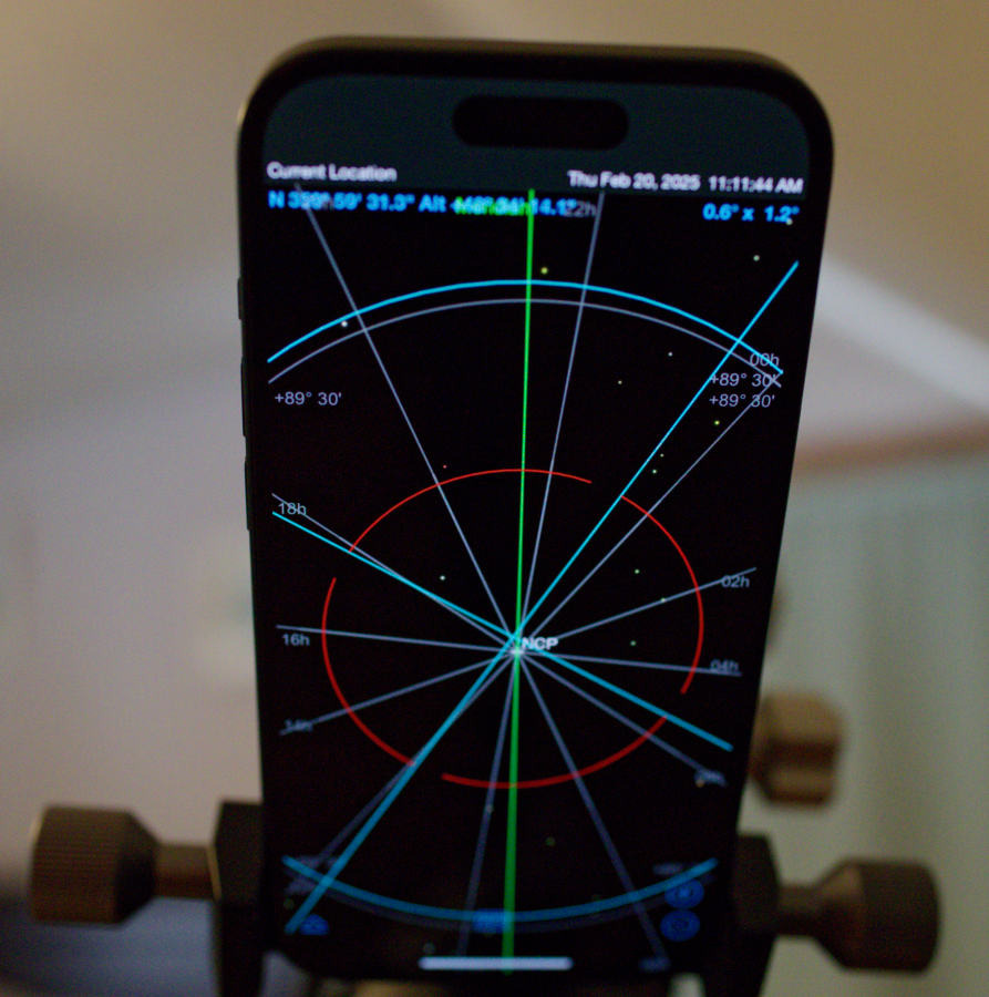 I add Move Shoot Move's cellphone holder to line up the celestial pole in the Sky Safari Plus app.